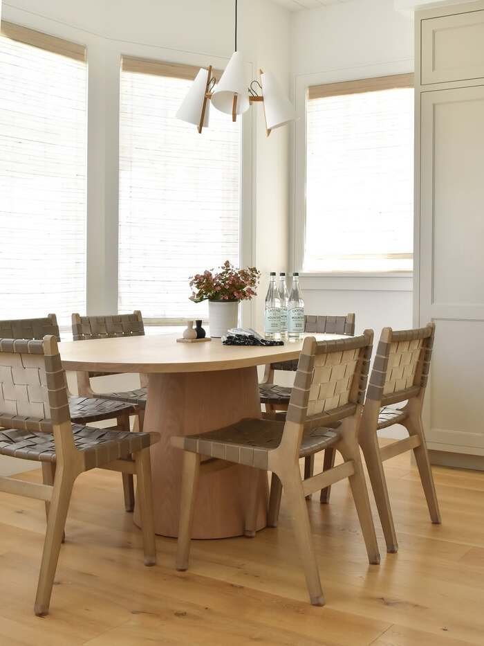 Minimal and bright: pedestal table + woven chairs that feel effortless