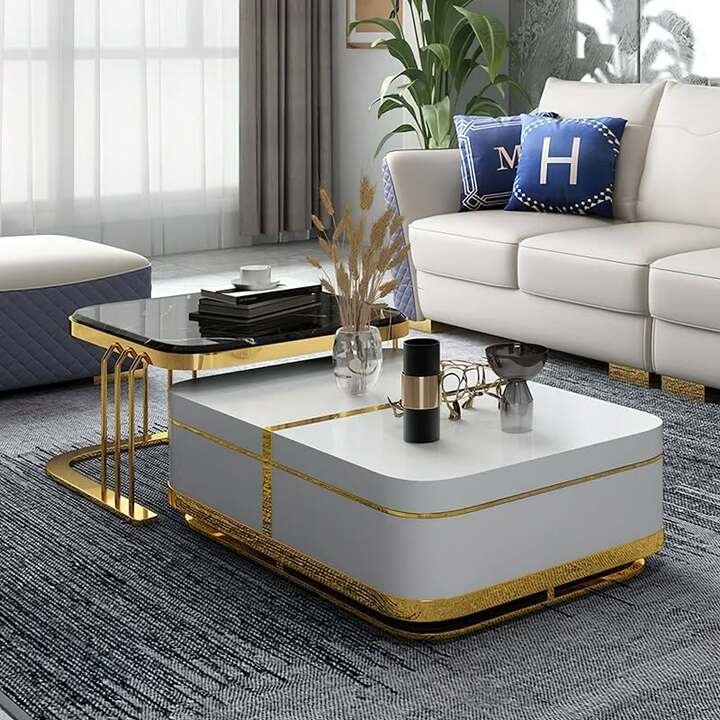 If your living room is small, a white and gold center table like this keeps the area bright. Marble patterns add interest without needing loud colors. Pair it with soft gray rugs or sofas, then layer in a few gold picture frames or candle holders. You’ll get that luxury center table vibe without making the room feel stiff.