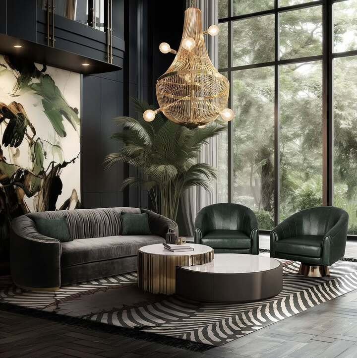 This next space feels like the living room of a movie star who reads real books. The curved gray sofa, deep green chairs, huge windows and that dramatic chandelier all circle around a pair of round center tables. The higher table has a white top and gold ribbed base. The lower one is darker and wider, almost like a calm little planet. Together they show how a center table living room luxury moment can anchor a whole layout without shouting.