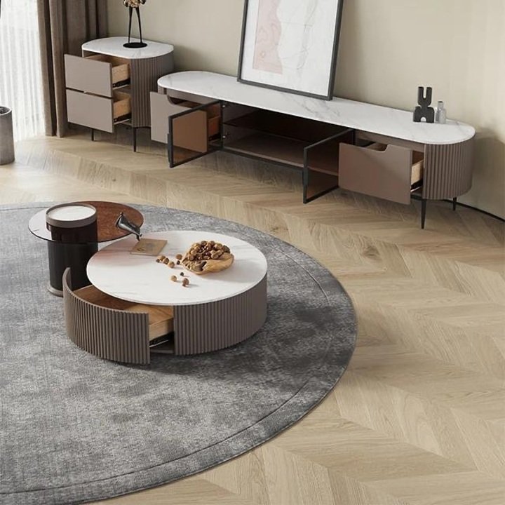 This next idea came from a reel where the creator kept opening hidden drawers and I literally gasped. The main table is a round design with fluted sides, warm taupe color and a white stone top. The drawers slide out from the curved base. Around the room, the TV unit and side cabinet repeat the same shape and texture. It proves that center table living room luxury can also be very practical, not just pretty.