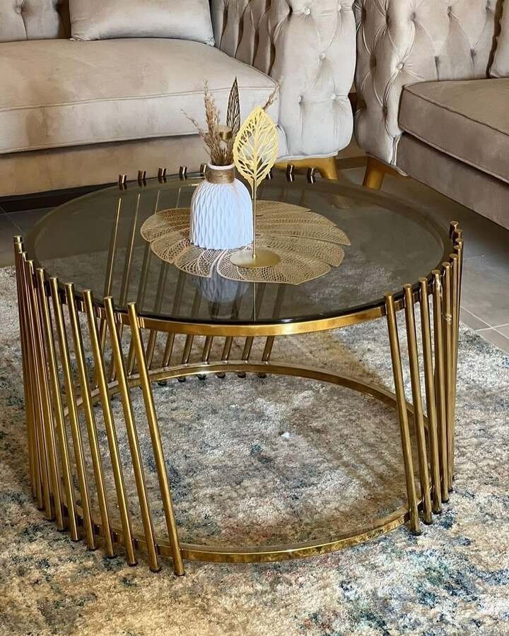 Here we move to a more classic glam style. The table is round with a smoky glass top and a base made of slim gold rods bent in a gentle curve. It sits between tufted beige sofas, on a soft patterned rug. The whole scene whispers hotel lobby energy in the best way, a real center table living room luxury statement.