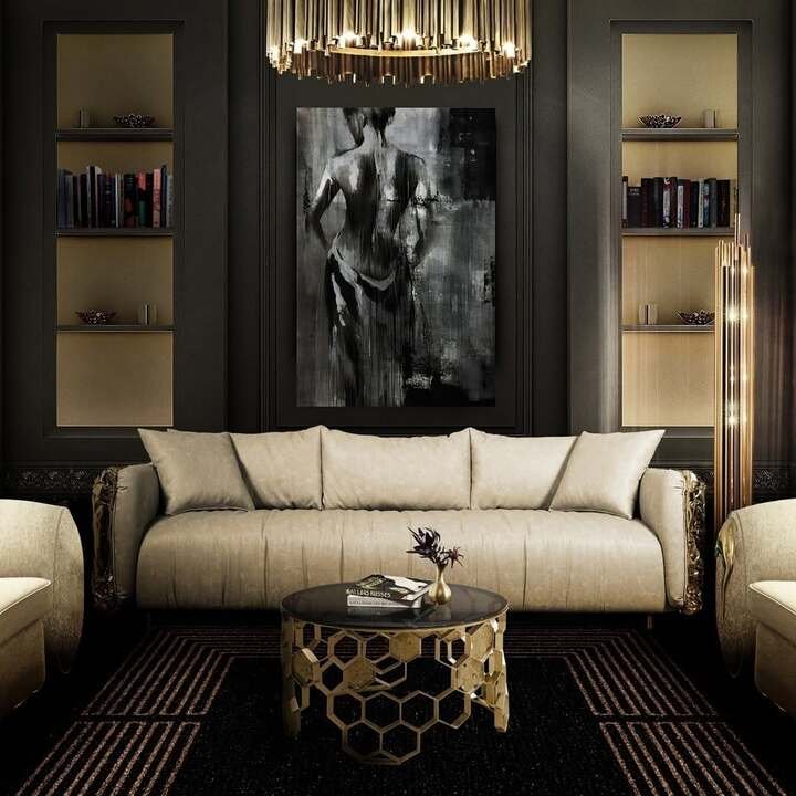 This room is like the older, more mysterious sister of the previous one. Deep charcoal walls, built-in shelves glowing with warm light, a cream sofa, and in the center, a round table with a honeycomb metal base and dark top. It is the kind of center table living room luxury that makes you want to speak in a slightly lower voice.