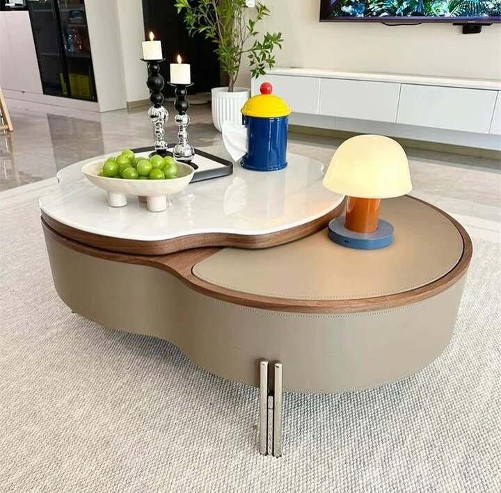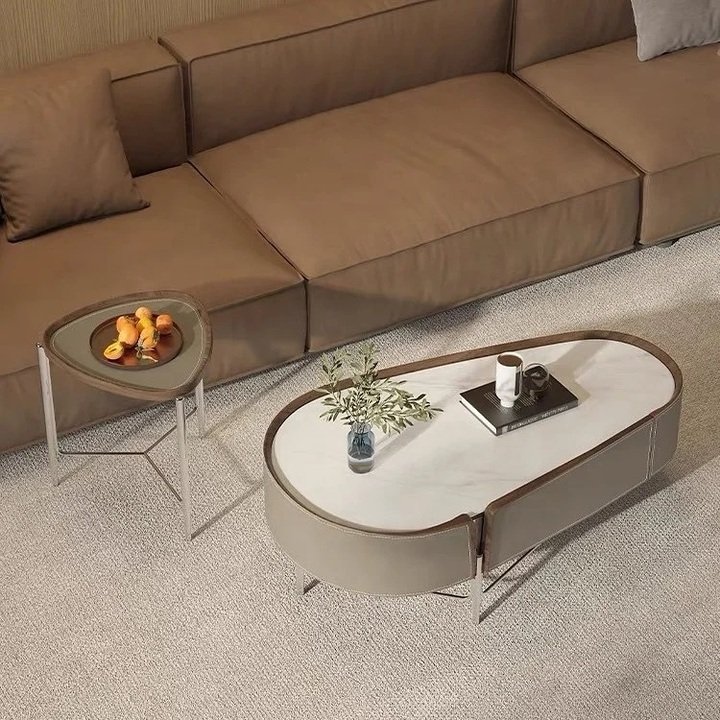 When I next saw these kidney-shaped tables next to the long brown sofa, I literally paused my scroll. The main table is low, soft, and has a white top with a leather-like band around it. The smaller triangle side table repeats the curves, so the whole center table living room luxury arrangement feels intentional, not random.