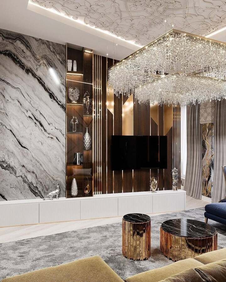 Now we are in full-on glam territory. The space has a giant square crystal chandelier, a wall of veined marble, bronze panels and two round tables with ribbed amber bases and dark tops in the center. It is intense in the best way. The pair of tables act like glowing gems, a double center table living room luxury focal point.