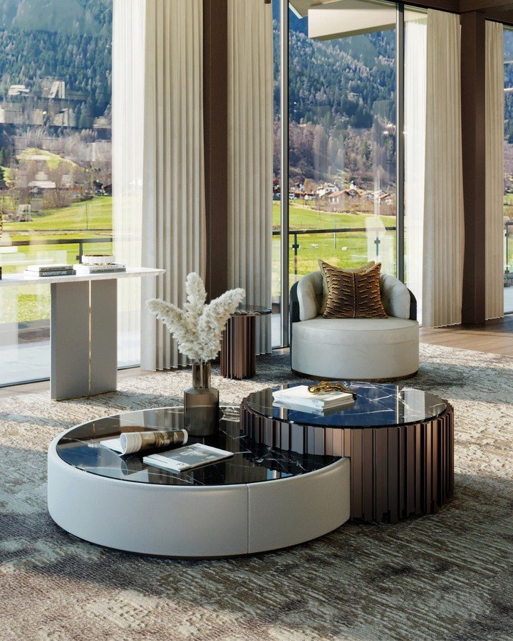 This living area makes me dream about a mountain vacation. Floor-to-ceiling glass shows a green valley outside, and inside there is a big round chair and two low circular tables. One is upholstered in soft white with a black glass top, the other has a vertical ribbed base. Together they create a relaxed center table living room luxury zone that almost feels like a hotel suite.