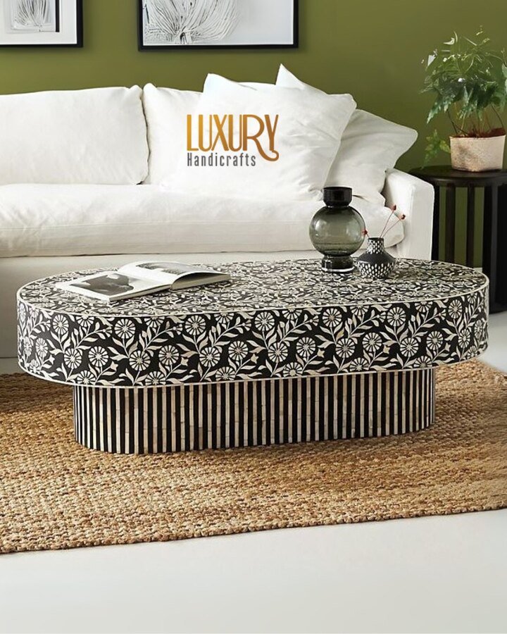 This one might be my favorite because it feels both fancy and warm. The table is an oval design covered in black-and-white floral inlay, sitting on a striped pedestal base. It rests on a natural jute rug, in front of a white sofa and olive green wall. It screams handmade center table living room luxury in a very friendly way.