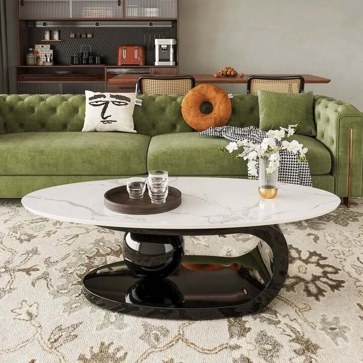 Here we see a long oval table with a white marble-look top and a glossy black sculptural base that curves around a central sphere. It sits on a pale patterned rug in front of a green tufted sofa. Honestly, it is the kind of center table living room luxury that makes guests ask, “Where did you find that?”