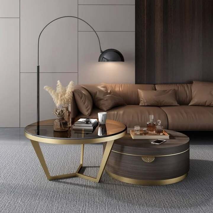 What really sold me on this luxury center table for living room spaces is how it works with that caramel leather sofa. Warm couch plus warm wood equals a cozy, hotel-lobby mood. If your house feels cold or too gray, choosing a round brown and gold center table can instantly soften everything. It is kind of like putting a candle in the middle of the room that never melts.