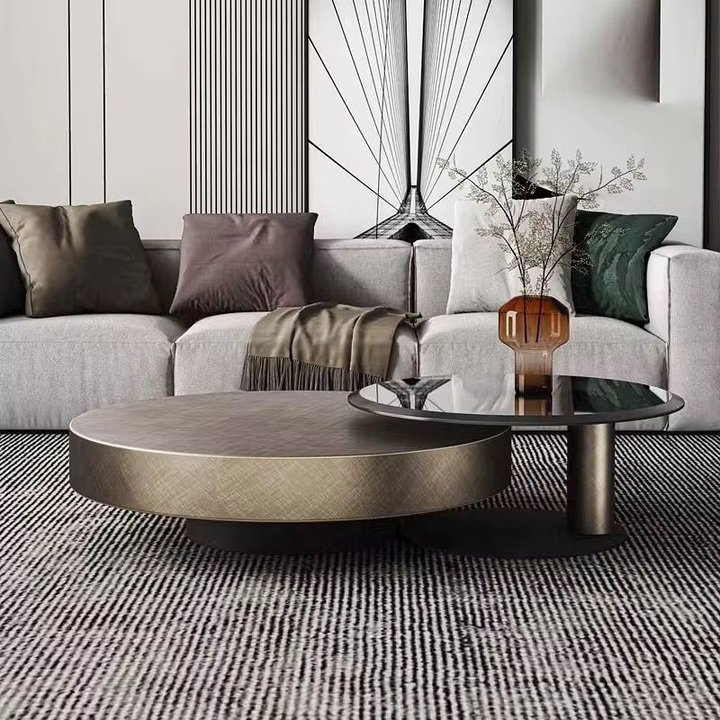The next design is calm and modern. There are two round tables: one wide and low with a brushed bronze texture, and one smaller, higher piece with a black glass top on a slim column. Together they sit on a fine striped rug in front of a pale sectional sofa. This is a very quiet center table living room luxury look, but still very chic.