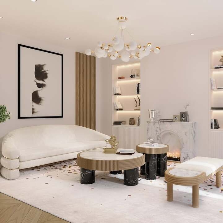 This next room feels like sitting inside a marshmallow, and I mean that in a good way. The curved white sofa, creamy rug, and sculptural chandelier all make the center table living room luxury setup feel gentle instead of stiff. The round nesting tables with ribbed sides and black marble legs are the real heroes. They add a little drama in a room that could easily feel flat.