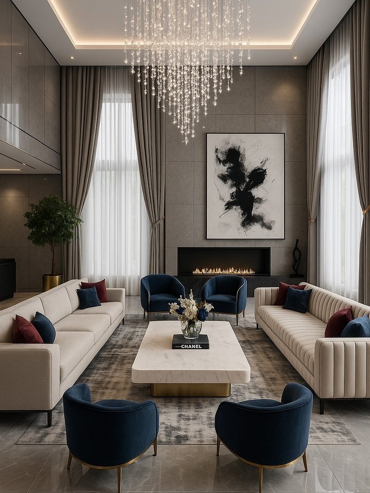 This space honestly looks like somewhere I would spill coffee and then cry about it, but it’s gorgeous. Two long cream sofas face each other, four navy chairs anchor the corners, and right in the middle sits a huge rectangular stone table. It is the most serious center table living room luxury mood of all the rooms here.