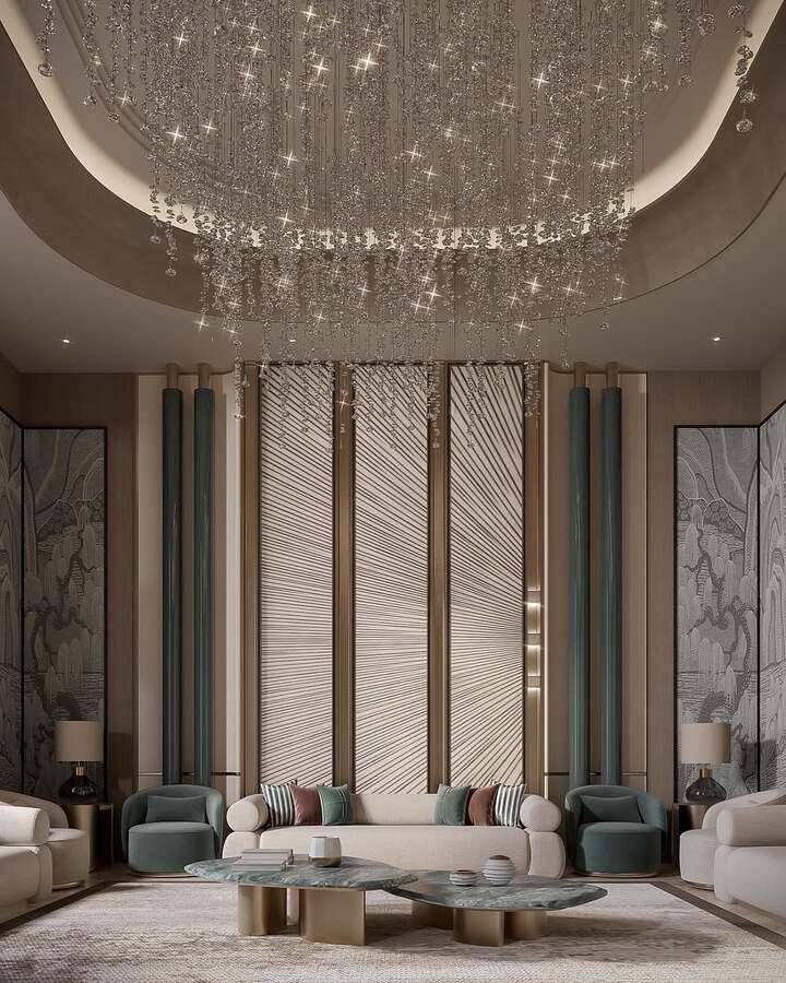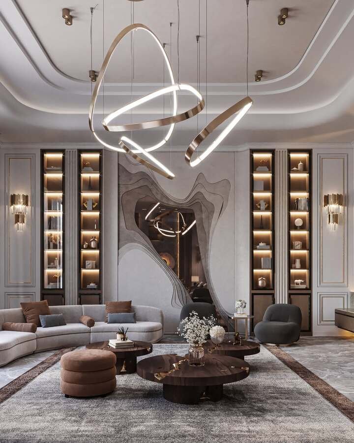 This design is what happens when modern art meets comfort. The wall has layered shapes, the ceiling lights are wild loops, and the seating curves in a soft arc. In the center, a cluster of dark round tables with gold accents create a multi-level center table living room luxury moment. It feels rich, but also kind of cozy because of the warm tones.