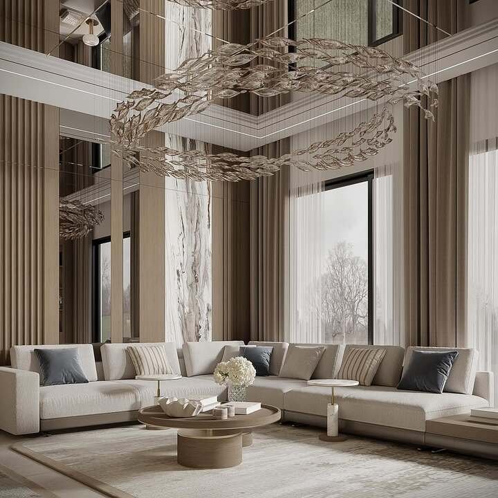 This living room is tall and airy but somehow still feels cozy. The L-shaped sofa wraps around a simple round wooden table that sits on a big pale rug. Above it, there is this crazy floating leaf-like chandelier that looks like it might start moving any second. The round table is not marble or gold, yet it fully carries the center table living room luxury vibe.