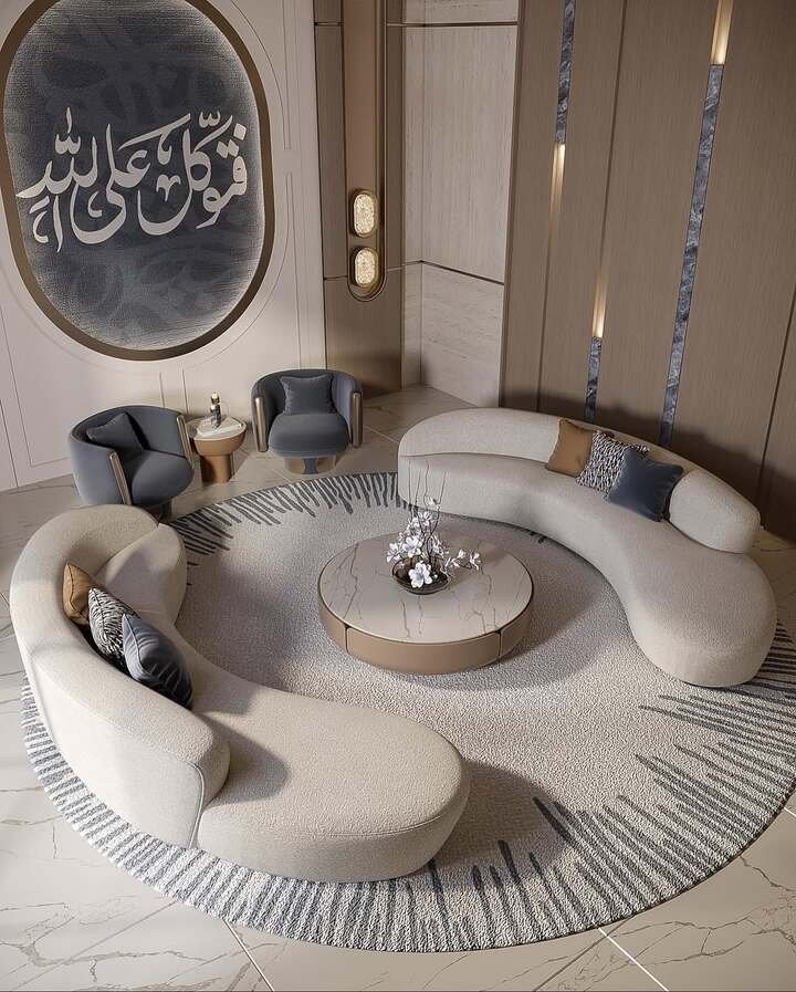 Out of all the designs, this one feels the most social. Two big curved sofas wrap around a round rug, and in the middle sits a circular table with a marble top and tan sides. There is also a wall with Arabic calligraphy that gives strong personality. This is a center table living room luxury layout built for actual people, not just for photos.
