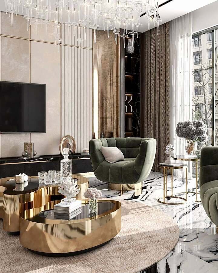 This room screams “I own at least one fancy perfume I never use.” The shiny gold tables with black glass tops, marble floor, patterned curtains, and chunky green armchairs all shout glamour. The center tables are shaped like soft blobs, which keeps the center table living room luxury scheme from feeling too cold or sharp.