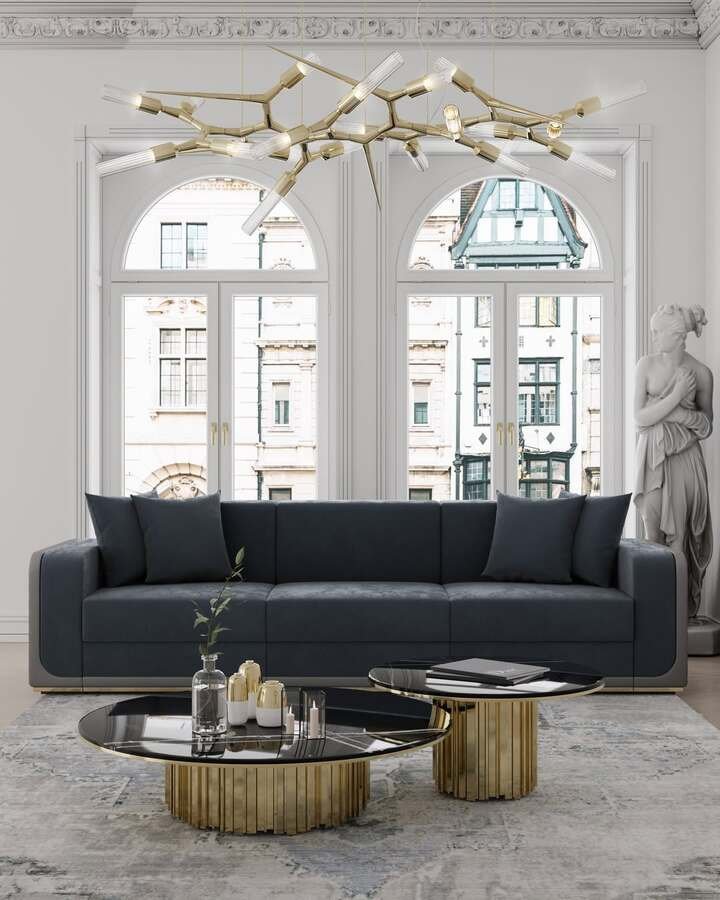 This space feels like a European apartment with very rich neighbors. Tall arched windows, detailed molding, and a deep blue sofa set the scene. Right in front, a pair of black and gold round tables form the center table living room luxury focus. The fluted gold bases almost look like tiny columns holding up the dark glass tops.
