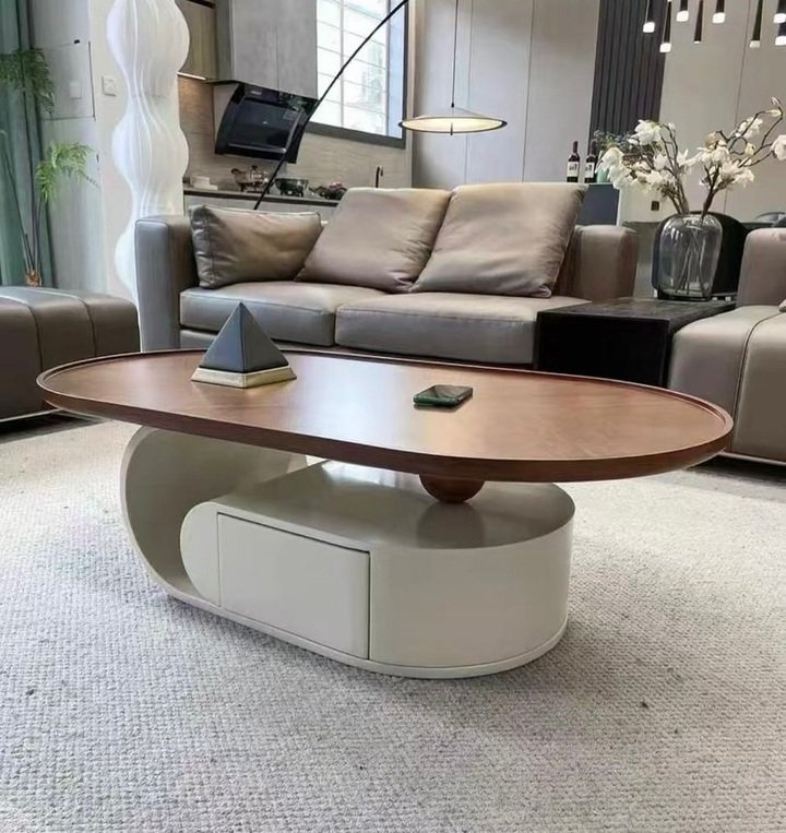 The last design might actually be the one I could copy without my wallet screaming. It has an oval wood top with a soft base that curves under like a loop. There is even hidden storage in the bottom, which is huge if you live in a small apartment. It is still a center table living room luxury idea, but it has real life energy.