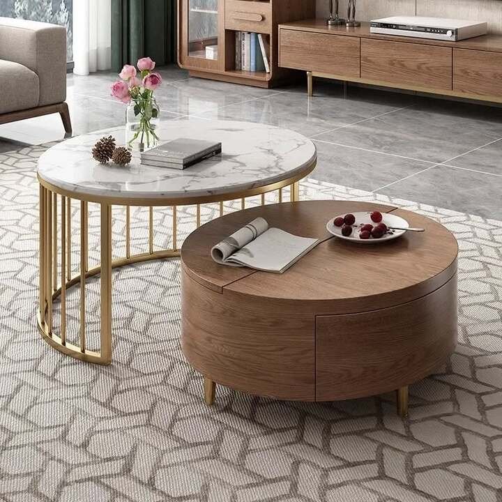 Next is the white double-round set with marble tops and ribbed storage. This one whispers center table living room luxury in a very gentle way. It reminds me of a quiet Sunday morning, when the house is finally clean and you can actually sit with coffee instead of folding laundry.