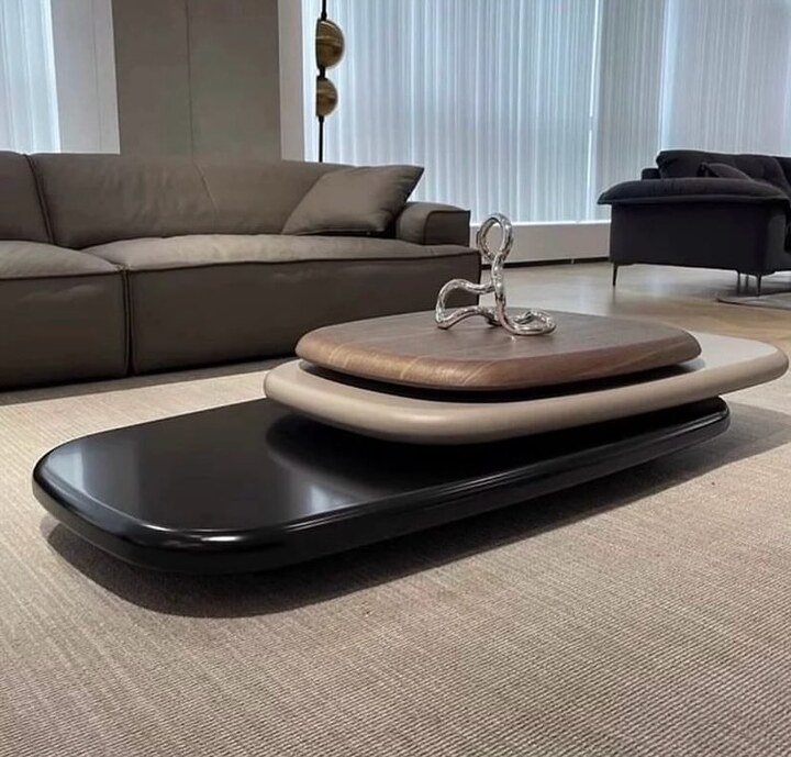 When I first saw the three-layer stacked table, I honestly thought, “This is what a spaceship coffee table looks like.” It is long, low and incredibly sleek, with a black base, a soft gray middle and a warm wood top. This is center table living room luxury for people who hate clutter and love clean lines.