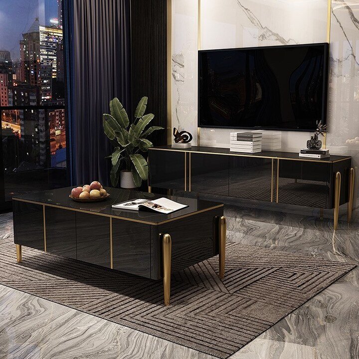 This next one is not just a table. It is a whole center table living room luxury moment with a matching TV unit. The glossy black surfaces bounce the city lights around the room, and the gold legs look like they’re wearing high heels. It feels very night-in-the-city, even if your real view is just the neighbors’ windows.