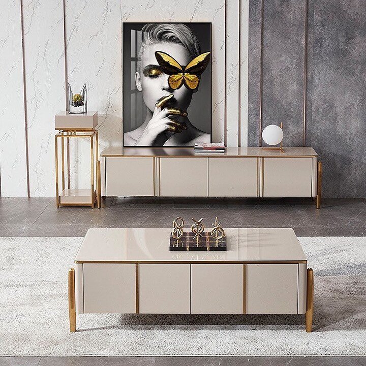 The next design is like the brighter, lighter sibling of the black set. Beige gloss, slim gold legs and a matching console under a big piece of art. This center table living room luxury style feels more airy and gentle, like a fancy gallery you can actually sit in.