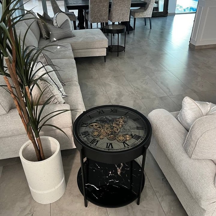 This one stole my heart because it is so unexpected. At first glance it is just a round black side table beside a pale couch. Then you notice the top is actually a giant clock with gears showing underneath the glass. It is center table living room luxury with a twist of steampunk.