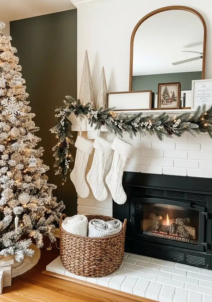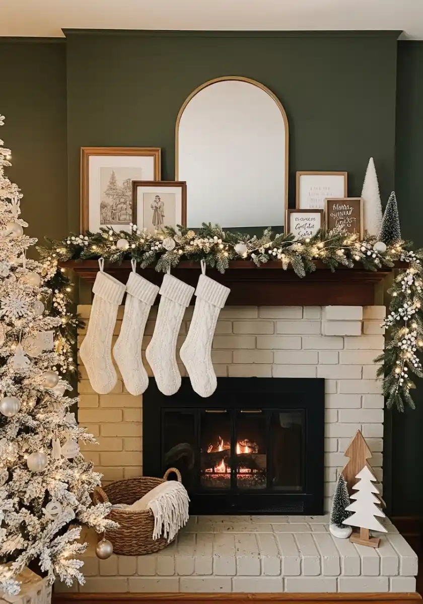 This final scene is moody and elegant. A deep green wall frames a rounded mirror and small art leaning on the mantel. The garland has frosted berries and tiny lights so it sparkles without yelling. Four ivory stockings hang low, and a flocked tree nearby repeats the white tones.