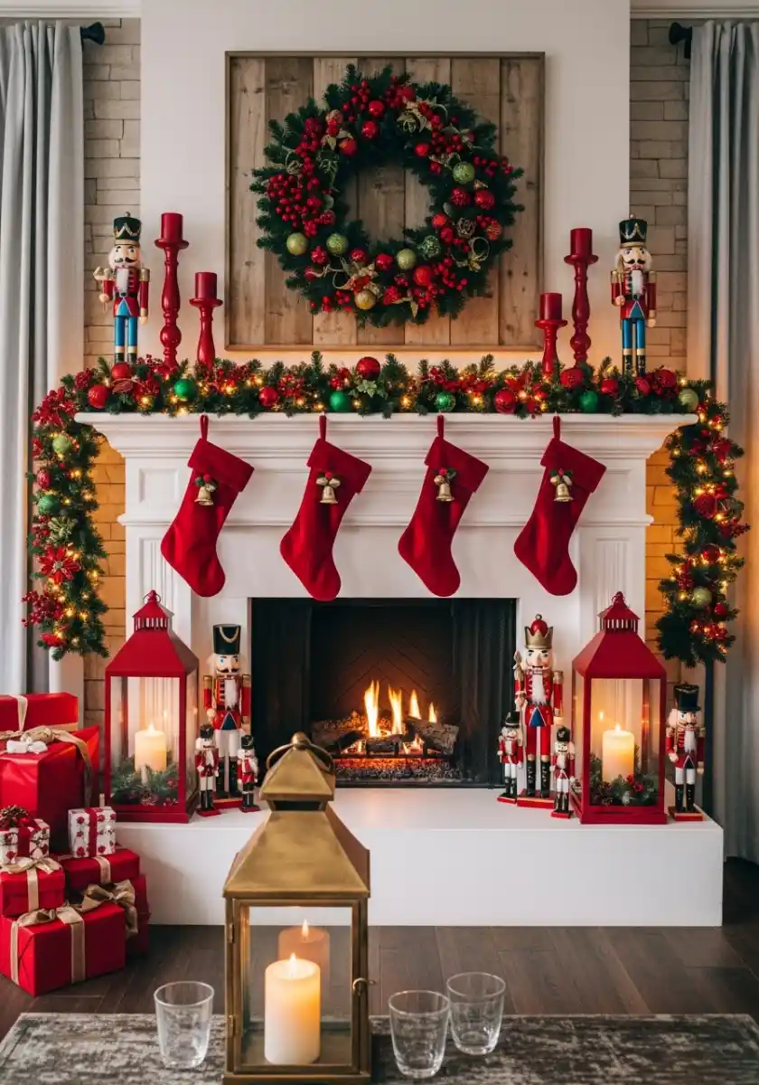 Chimney Christmas Decor: Nutcracker reds with glowing garland