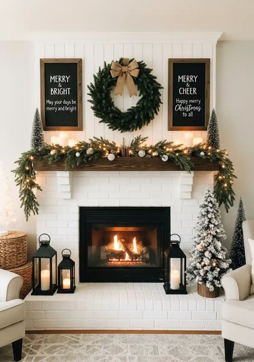 To keep it from getting too pale, add a faux window frame mirror behind the wreath. The wood tone gives depth. I’d tuck a couple of white ceramic houses at one end. This chimney christmas decor feels like alpine cottage without trying too hard. If you want a related variation, think neutral fireplace mantel decor with knits and frost.