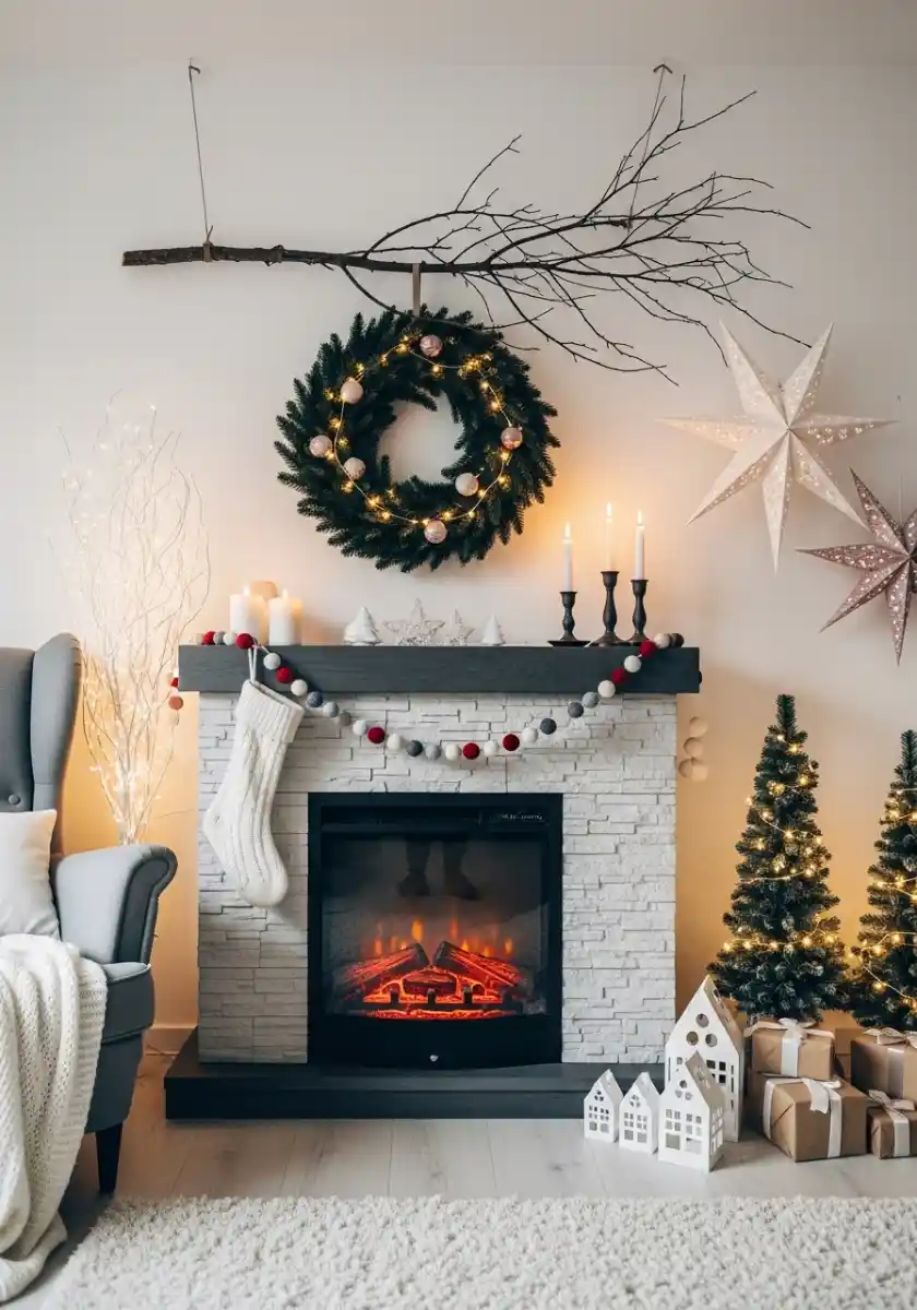 Keep the color palette soft, like cream, blush, and charcoal, so it reads Scandinavian. I swear by felt garlands because they don’t tangle or fray. Add two slim trees on the floor for height and a single stocking for a sweet, storybook vibe. If your fireplace mantel Christmas decorations usually get too busy, try this. The negative space around the branch is the design. Resist the urge to overfill.