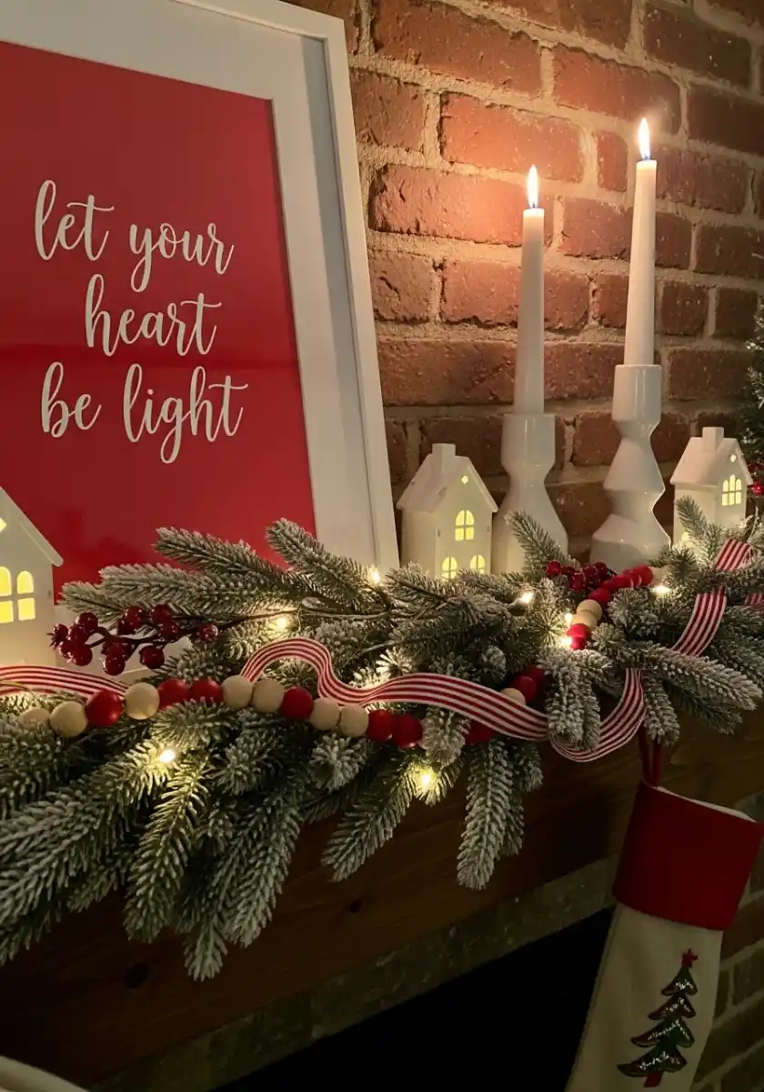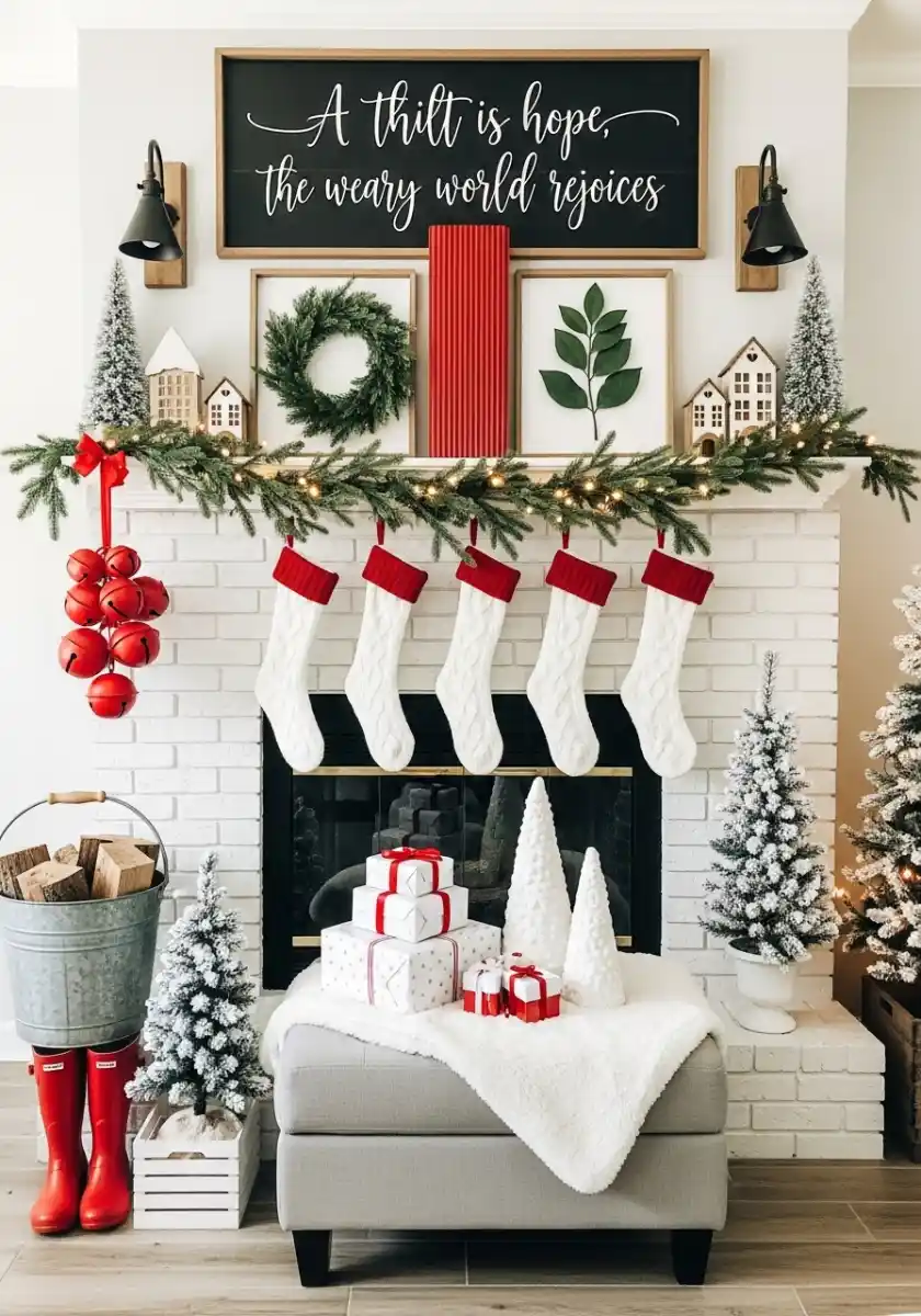 This chimney christmas decor is playful and organized at the same time. I’d keep the color story red, white, and evergreen so the bright sign stays the hero. If you try a version of this Christmas mantel decor, keep house sizes varied and put the tallest near the center. A symmetrical base lets you add whimsy without chaos.