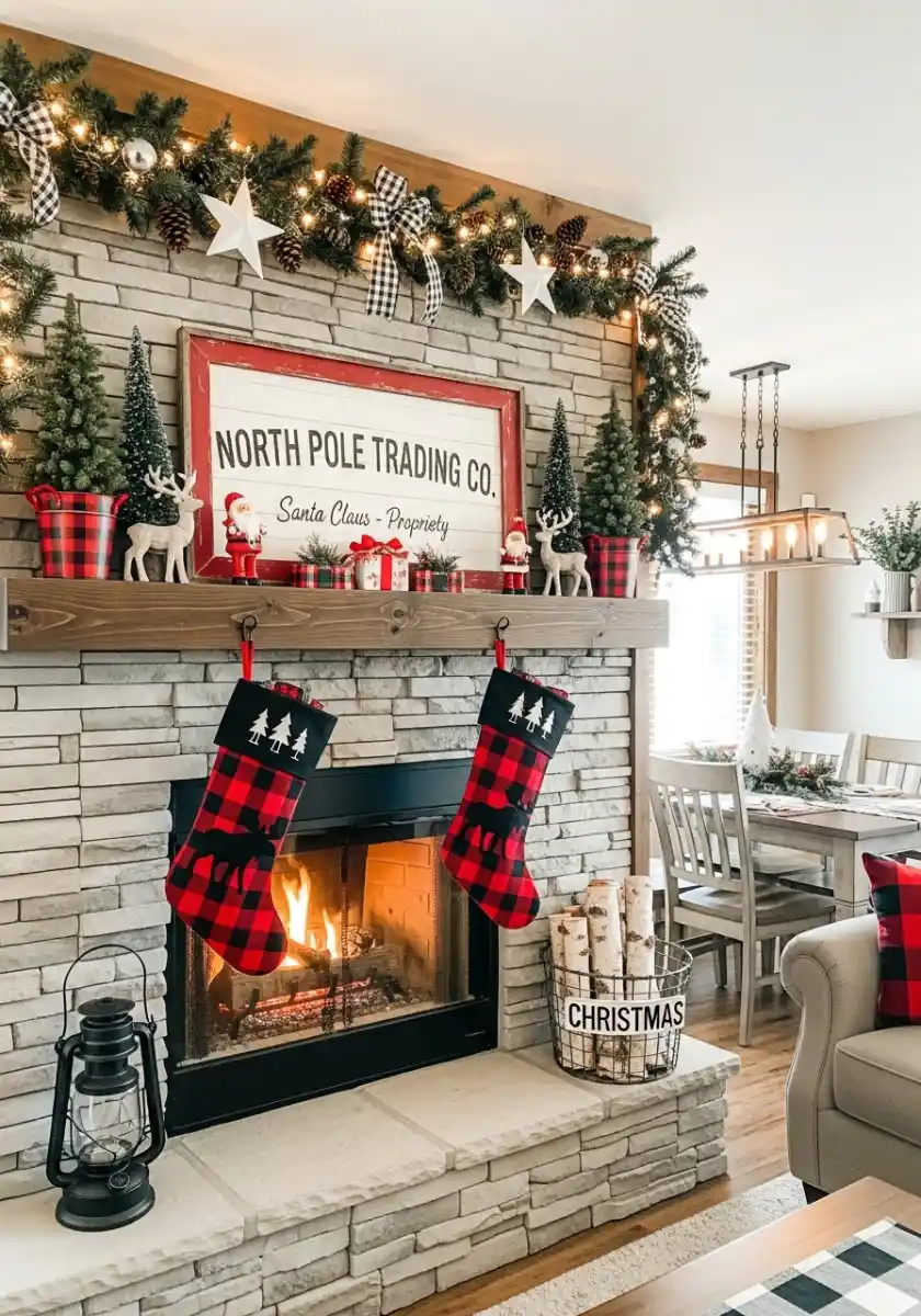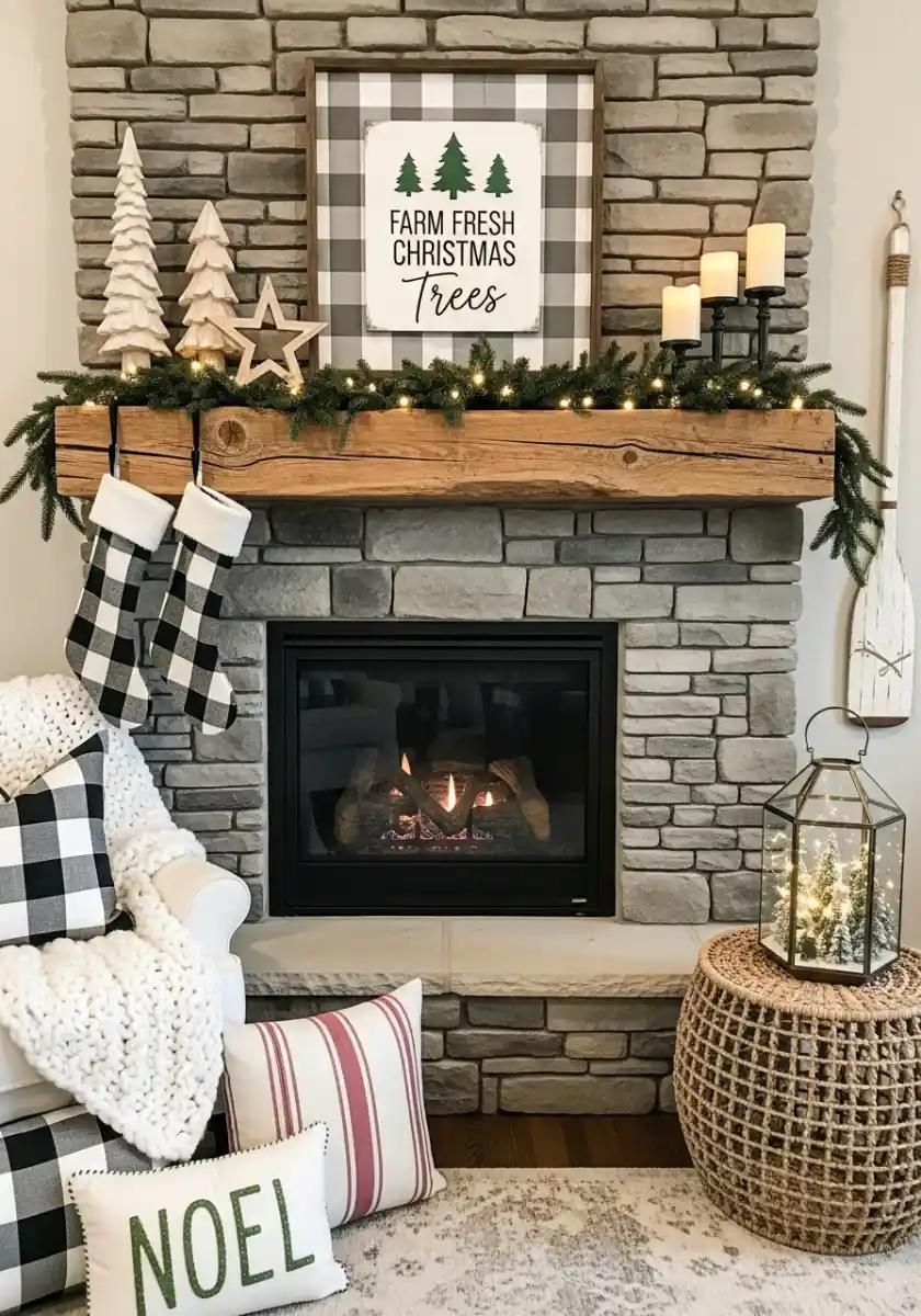 This one feels like cocoa after sledding. Stone fireplace. Farmhouse sign. Stars and bows and plaid everywhere. The secret is letting patterns repeat, not fight. Use buffalo check stockings, then echo the black-and-white check with bows in the garland. Keep your accent color red, then let the natural pinecones and little bottle brush trees break it up. It’s classic mantel Christmas decorations with a story.