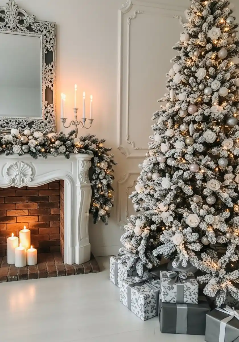 This mantel made me gasp. It’s like Paris decided to spend December in your living room. Ornate white surround, frosted garland studded with pearl ornaments, and a flocked tree filled with white roses. Very bridal, very dreamy, somehow still homey. If your style leans romantic, go monochrome. Keep your Christmas fireplace styling in shades of white and cream, then add warm lights to keep it soft instead of chilly.