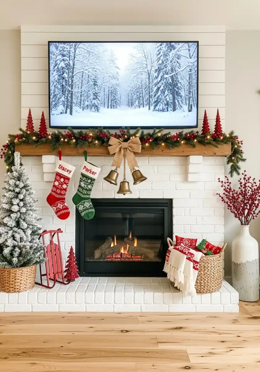 Some of us have a TV over the mantel and pretend we don’t. Here’s proof you can have both. A wooden shelf supports a berry-filled garland with a giant bow and three hanging bells, flanked by mini red trees. Personalized stockings keep it playful. When the screen is on a winter scene, the whole wall becomes animated. I’ve started running a loop like that during parties and people love it.