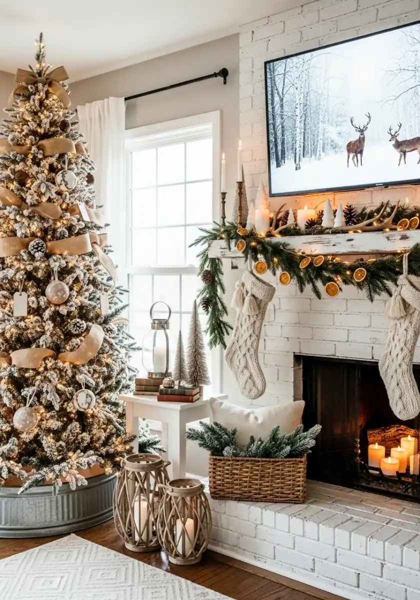 I’m biased because citrus is my thing. I dry orange slices in the oven and hang them everywhere. On this whitewashed mantel, the garland is lush but the drama comes from those translucent orange wheels that glow at night. Pair with chunky knit stockings, brass candlesticks, and a few antlers or wood accents for a rustic-meets-Nordic feel. It smells faintly amazing, like a secret potpourri.