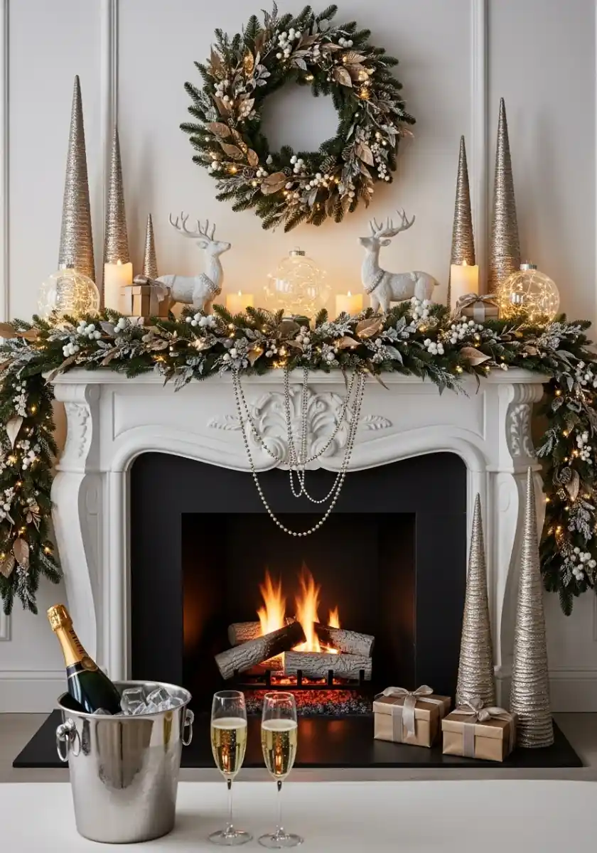 I saved this one for last because it’s the “pop the bubbly” moment. Brushed metallic cone trees, white deer, pearl-tipped garland, and a lush wreath with frosted leaves. There’s literally a champagne bucket on the hearth. This is holiday mantel decorations for New Year’s too. Keep the palette to champagne, silver, and soft gold, then add warm white lights so it glows like a city at night.