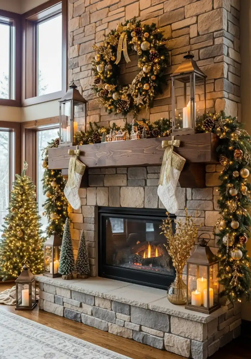 chimney christmas decor: Stone-and-Gold Lodge Glow
