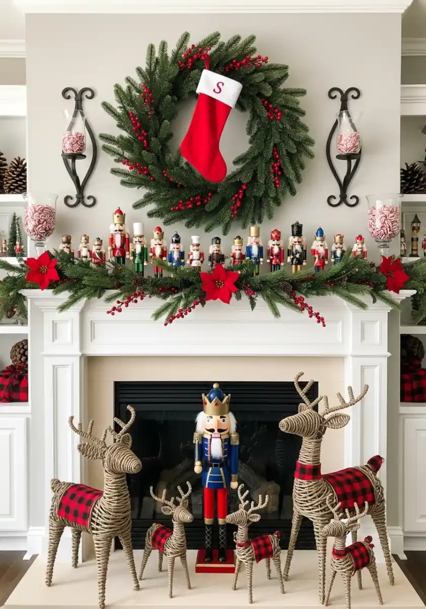 The second room shouts merry in the best way. A thick wreath with a single red stocking in the center sets the tone, then a garland packed with berries, poinsettias, and glitter ornaments runs edge to edge. The show stealer is the nutcracker collection lined across the mantel like a tiny guard. Below, woven reindeer wear buffalo-plaid saddles. It’s playful chimney christmas decor that still reads classic.