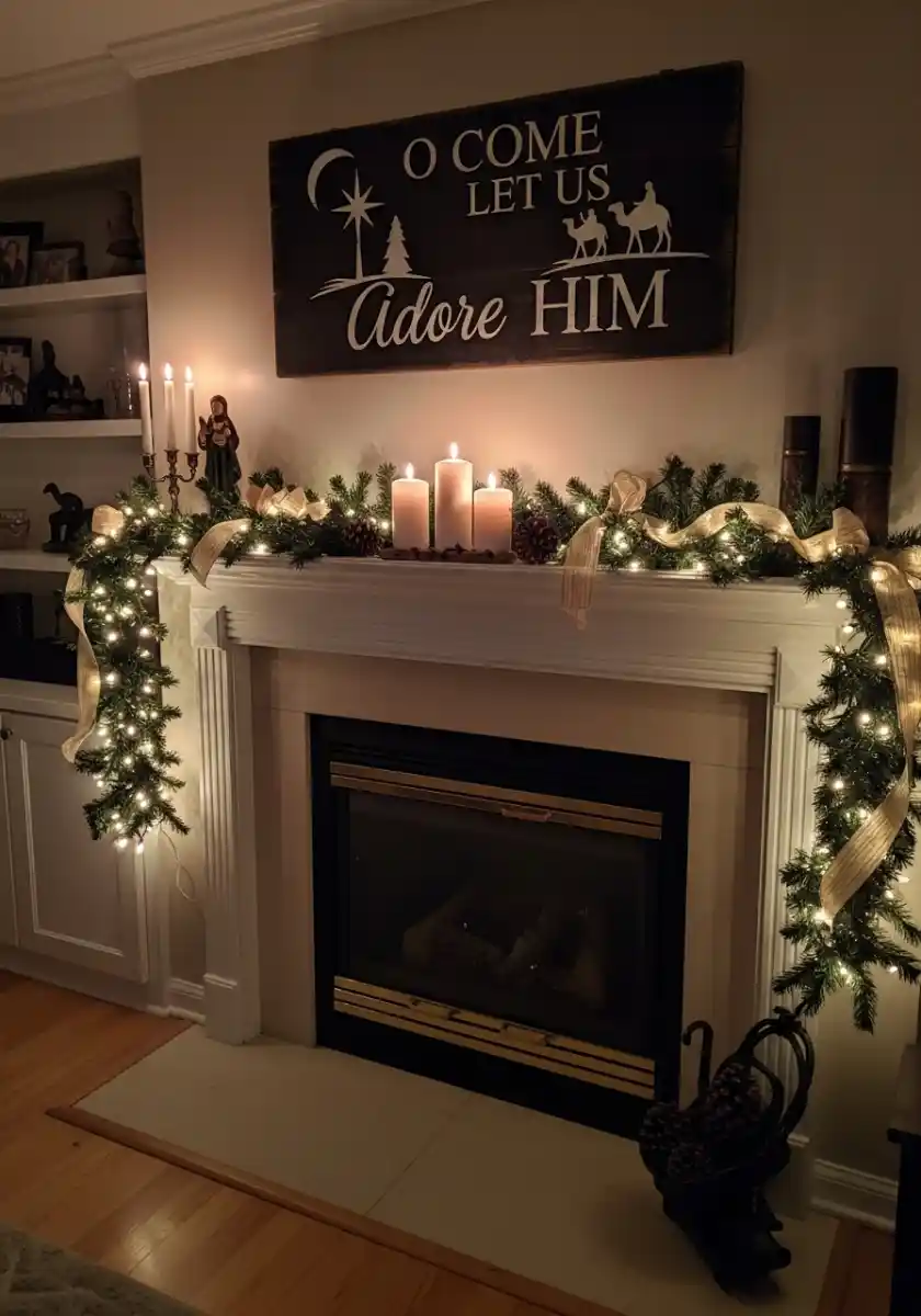 Sometimes I want the living room to feel hushed. Here, a wooden sign that says “O come let us adore Him” sets the mood. The garland is green and classic, but a champagne ribbon weaves through with tiny warm lights. I like pillar candles in the middle, then taper candles on the side so the eye moves across.