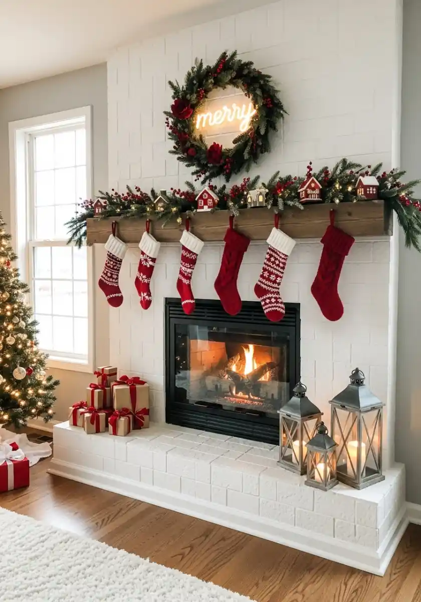The star is a wreath that literally says “merry” with a soft glow. Under it, miniature houses run across the mantle like a tiny Main Street. Red stockings line up below, and two big lanterns sit on the hearth to echo that warm light.