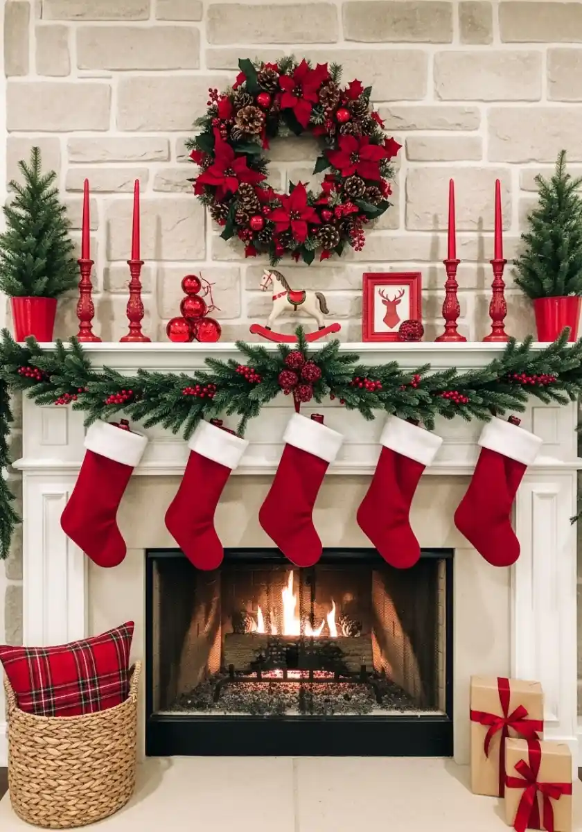 This is chimney christmas decor for big family rooms. If your stone surround is warm beige, the red reads rich, not loud. Add two mini evergreens in pots to frame the scene. For a variation keyword, call it holiday mantel decorations with poinsettias and berries. It’s evergreen in every sense.