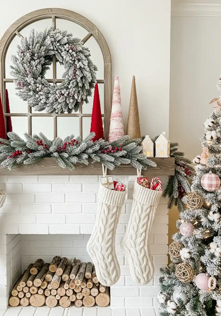 If you love calm winter mornings, this is your mood. White cable knit stockings, an arched mirror, frosted garland with tiny berries, and a snowy tree nearby. I keep calling this my “marshmallow mantel.” It’s very tone-on-tone, so texture has to do the heavy lifting. Knit, wood, glass, flocked branches. When you layer textures, your Christmas chimney decor looks rich without adding loud color.
