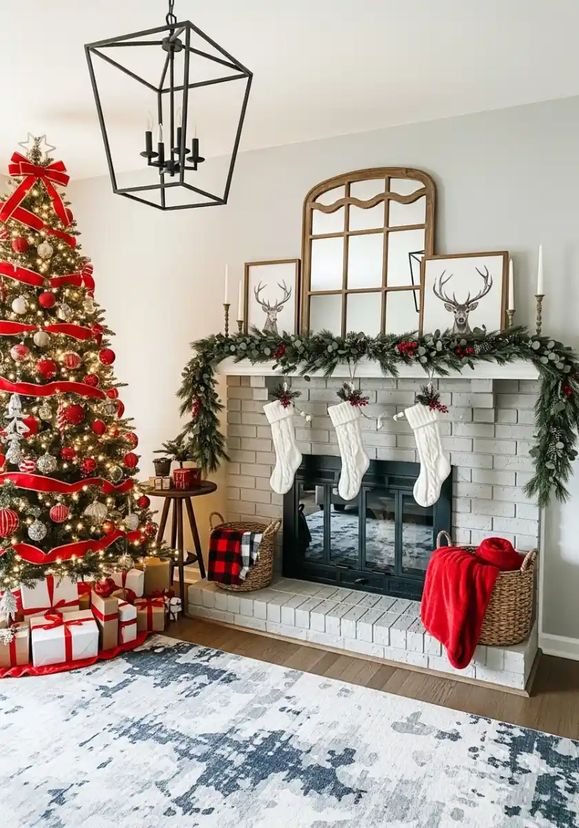 This living room mixes a bold tree with deer art in soft black frames. The mantel is classic green with eucalyptus and red berry clusters, and three white cable knit stockings keep it calm. I am obsessed with the red ribbon running down the tree. It ties the whole room together, like a bow on a present.