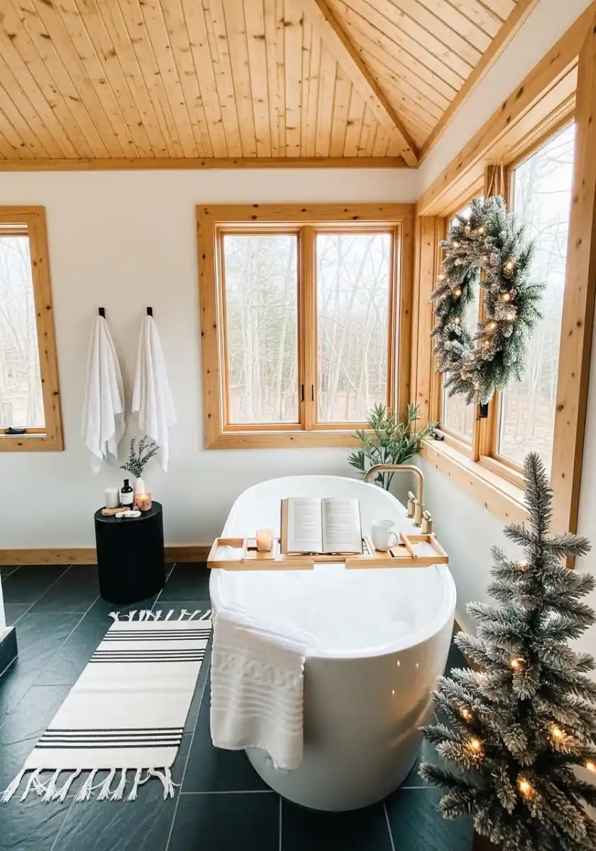 This cozy tub corner feels like a private cabin. The wood ceiling, frosted wreath, and mini tree give warm texture, while the white freestanding tub stays crisp and airy. I love the bath caddy with the candle and book because it says please stay a while. If your bathroom has good natural light, a white winter bathroom decor setup like this makes the light bounce around and look soft, almost like snowfall. Keep the palette tight so the eye rests. Use one black piece, maybe a small side table, to ground the space.