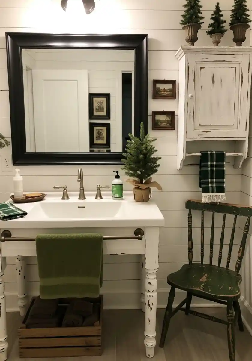 This one is farmhouse in the best way. A simple sink table with turned legs, a black framed mirror, and chippy cabinet set the tone. Then tiny trees, a plaid towel, and a worn green chair bring life. The base is mostly white Christmas bathroom decor so the greens feel bright, not heavy.