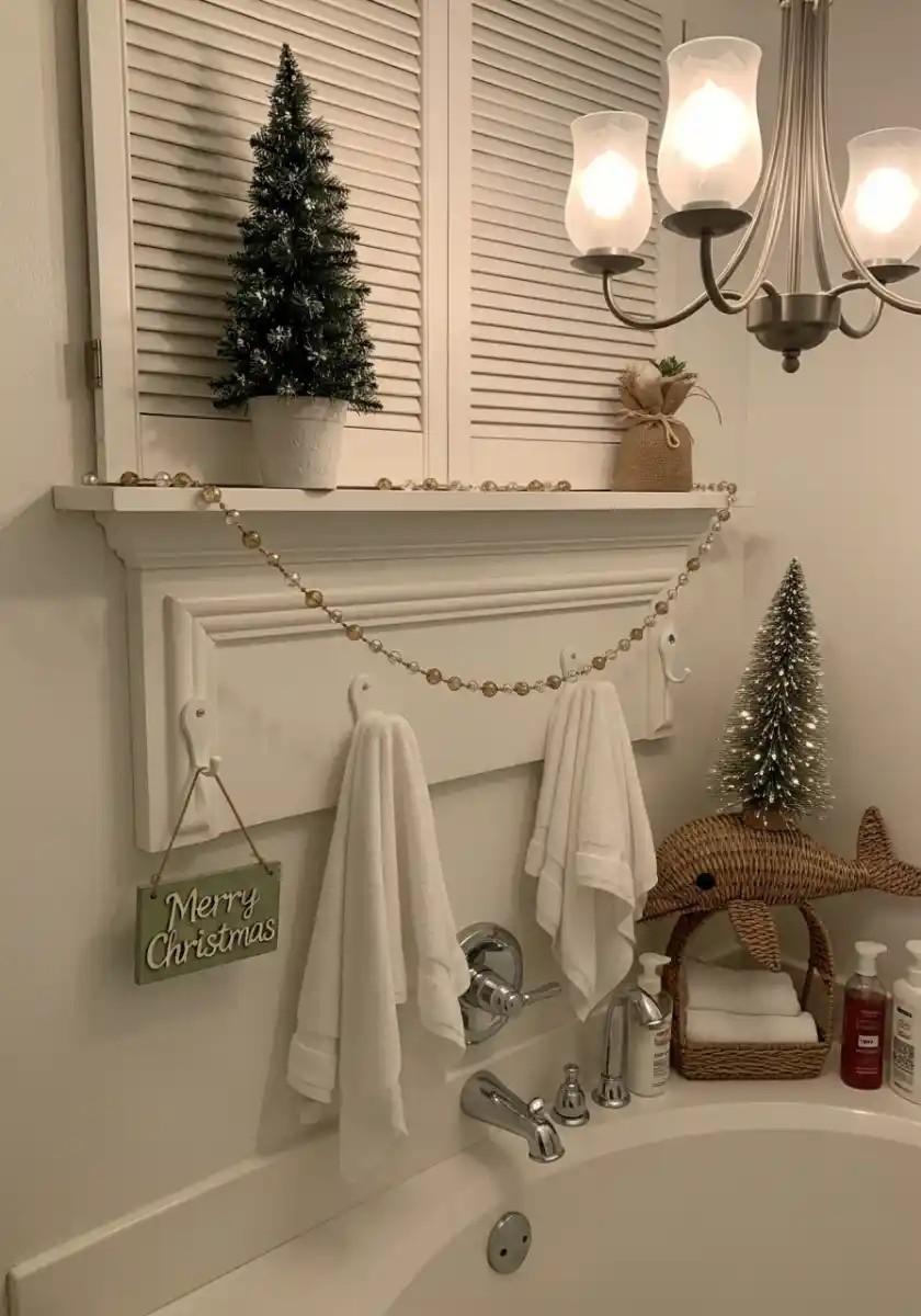 This room is small but warm, and it proves tiny spaces can still feel merry. A narrow shelf sits above the tub with a flocked mini tree in a white pot. A bead garland drapes across the rail, and the hooks hold soft white hand towels. There’s a wicker dolphin basket, which sounds funny, but it sneaks in natural texture so the whites don’t feel cold. The light fixture glows soft and cozy, perfect for long baths.