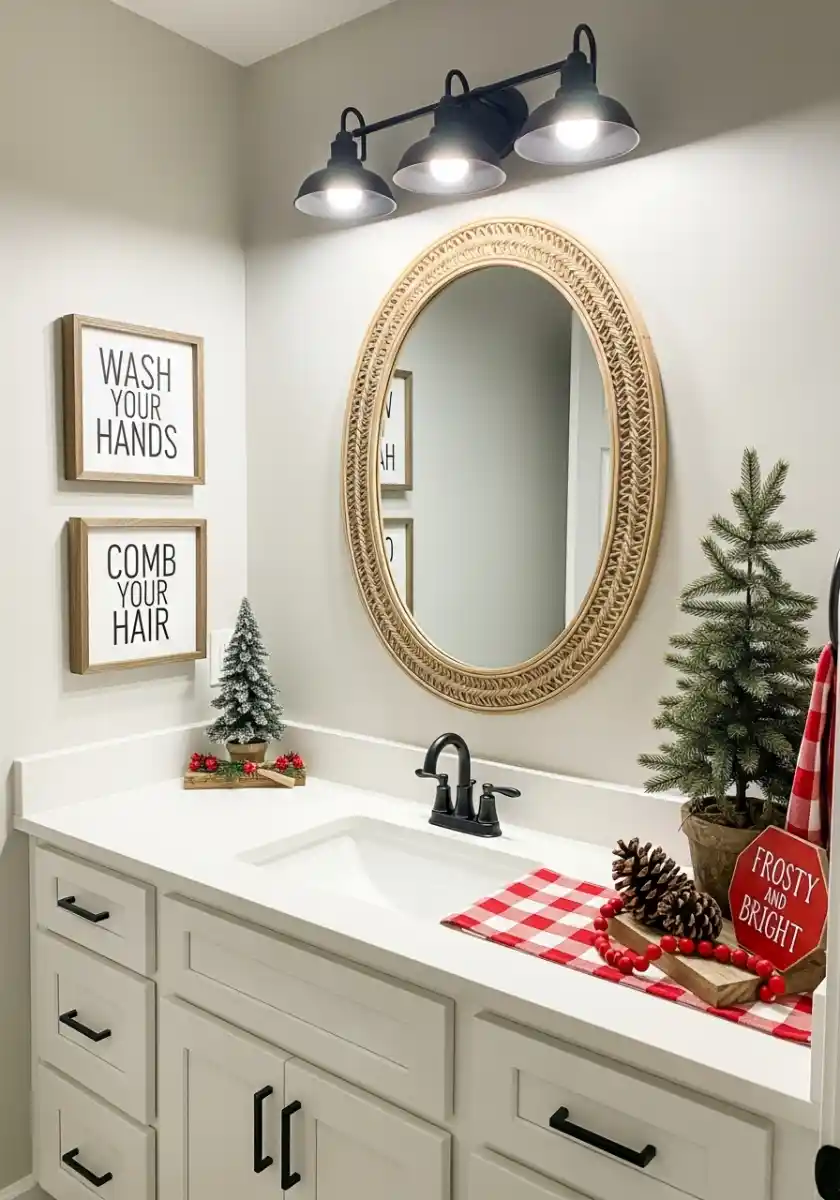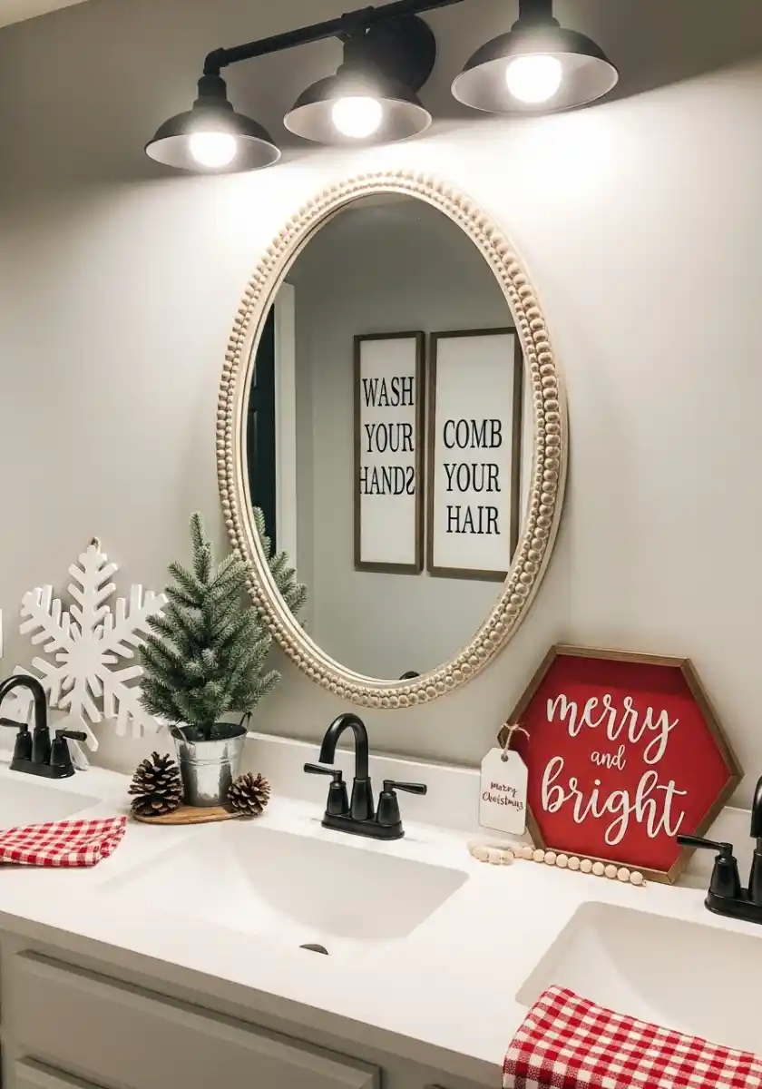 This vanity keeps the bones clean while the decorations do the flirting. You’ve got a woven oval mirror, matte black faucet, and two playful signs that say Wash your hands and Comb your hair. A red check cloth, pinecones, and a tiny potted tree bring fun movement. The counter stays clear which matters with white bathroom Christmas decor because clutter ruins the hotel feeling fast.