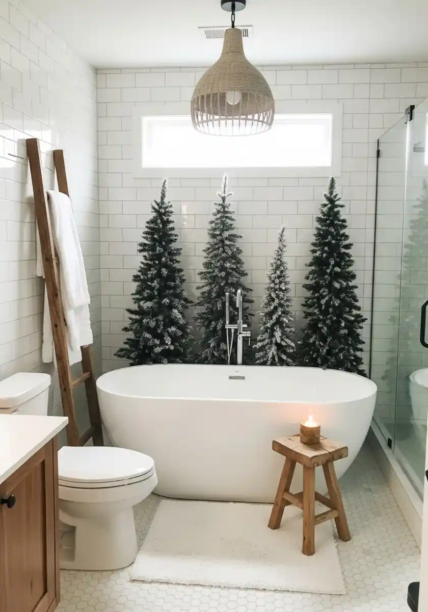 If you’re a calm person at heart, this one is your winter bestie. A row of tall, skinny flocked trees stands behind a white tub, like a quiet forest outside the window. A wood stool holds a candle. A towel ladder adds warmth and a little rustic. The whole scene is white minimalist Christmas bathroom decor that still feels festive.