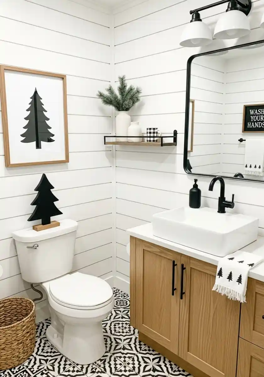 Shiplap walls, a square mirror with rounded corners, and a black faucet build a strong base. Graphic tree art and a small block tree on the toilet keep it playful. The patterned floor is bold but still reads neutral because it’s black and white. Add a tiny vase with evergreen stems and you’ve got white bathroom Christmas decor that works great in small powder rooms.