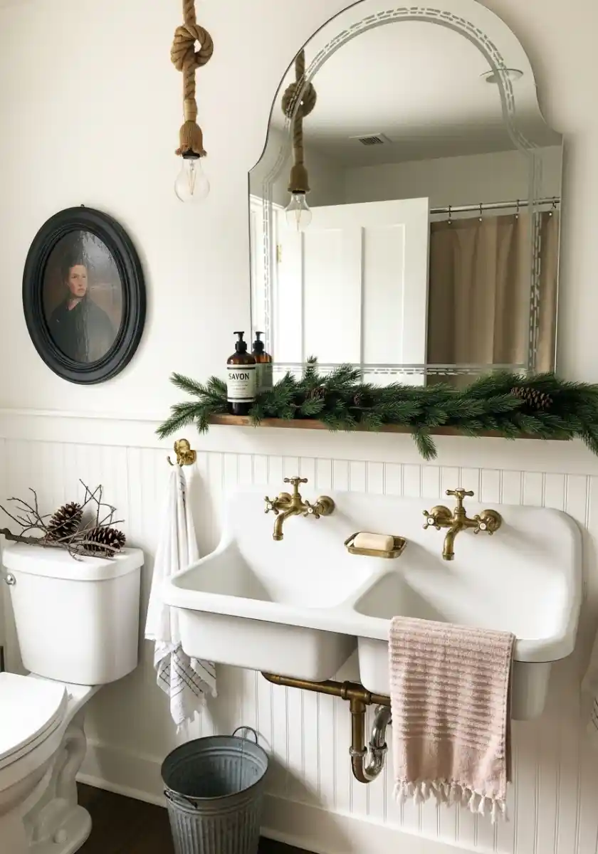 The double apron sink with old-school brass taps feels like it came from a sweet country inn. Beadboard walls and a rope pendant add texture that pairs well with white bathroom Christmas decor. The simple mantel-like shelf under the mirror is a gift because you can tuck a low spruce garland there. I’d mix in a few pinecones and one bottle of amber soap to warm up all the white.